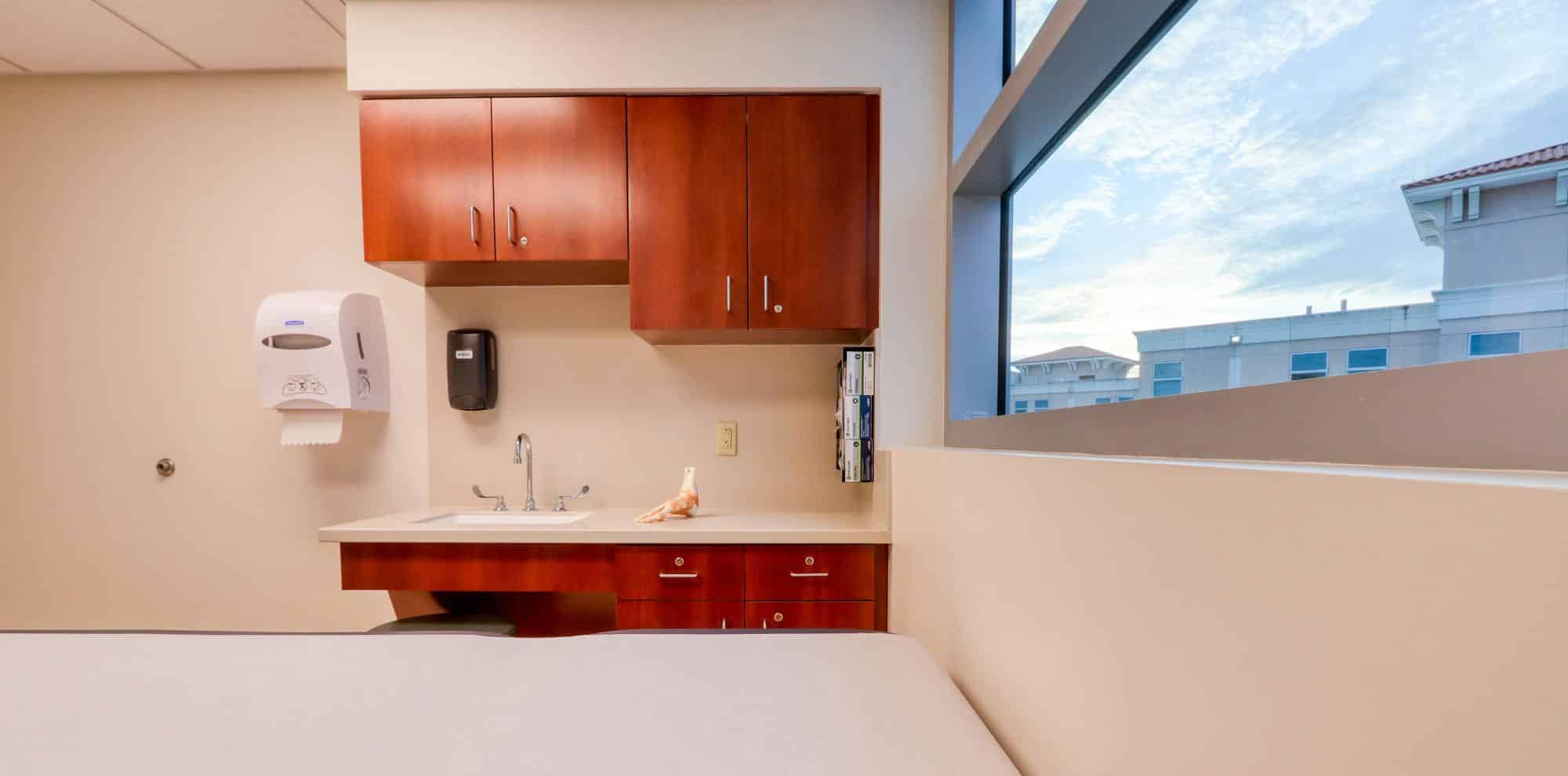 The Dade Construction team fully renovated the Miami Orthopedic & Sports Medicine Institute (MOSMI) in West Kendall Baptist. This medical center renovation was a total of 3,300 SQ FT and featured many finishes. To expand the office, some areas became demolished. The new drywall and framing created more hallways. Ceiling, flooring, and paint once completed were applied to new walls. Custom cabinetry was installed in the patient rooms which required new plumbing for all sink installations. With the expansion, new electrical work was needed concluding in new outlets and recessed lamps all through out.