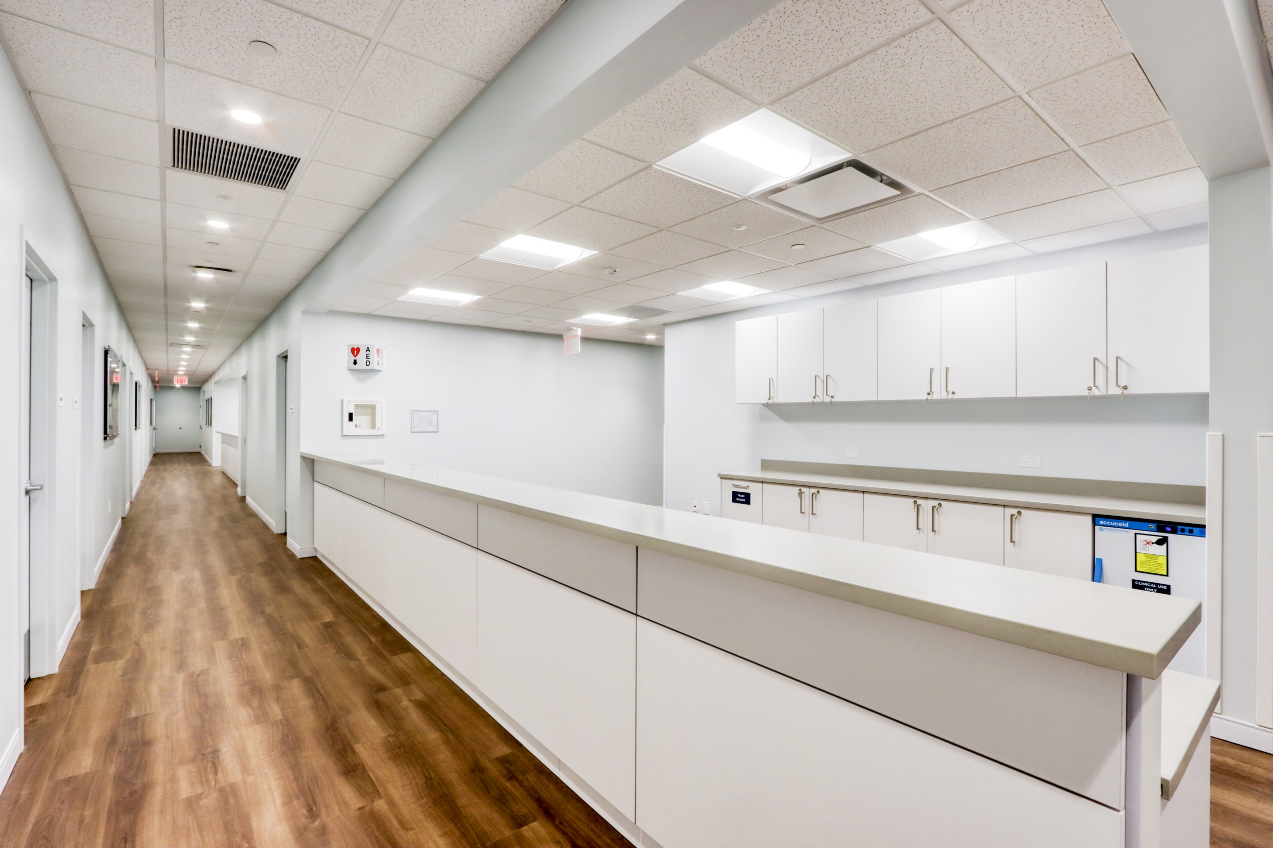 This healthcare facility was designed with a focus on comfort, functionality, and modern efficiency. The layout supports seamless patient flow while maintaining a calming, professional atmosphere through the use of soft blue hues, warm wood flooring, and clean white millwork.